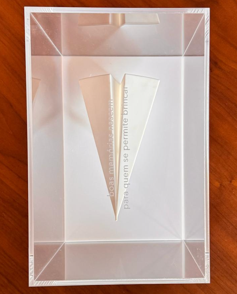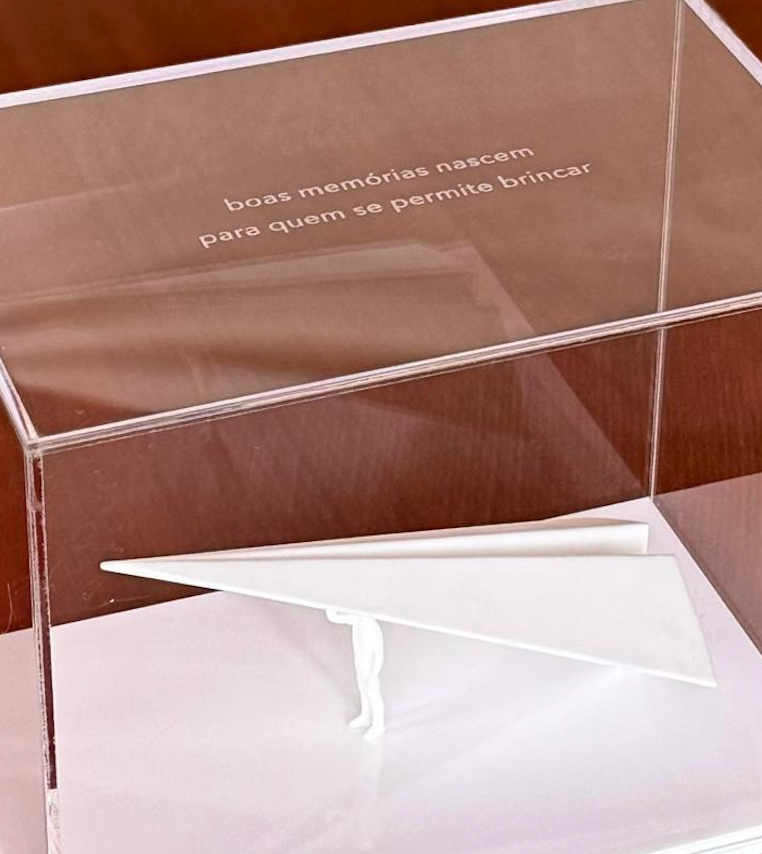 Escultura de menino segurando um avião de papel dentro de caixa de acrílico com frase inspiradora.
